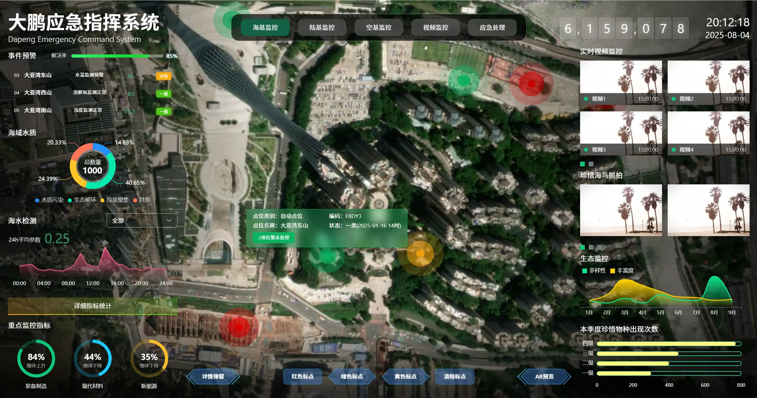 使用 cesium 实现的三维大屏展示,实现了涟漪动画标点,弹窗展示; 多个定制化可视化组件, python 结合 ffmpeg 实现视频流rtmp转码